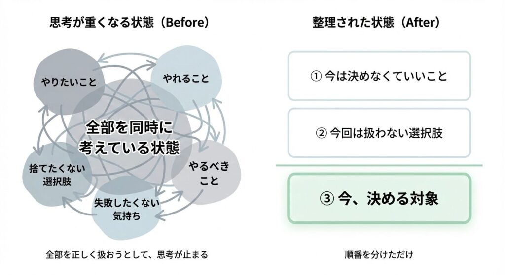 「AもBもCも悪くない」と感じている状態で、同時に「どれを捨てるか」を考えてしまうと、思考は必ず止まります。