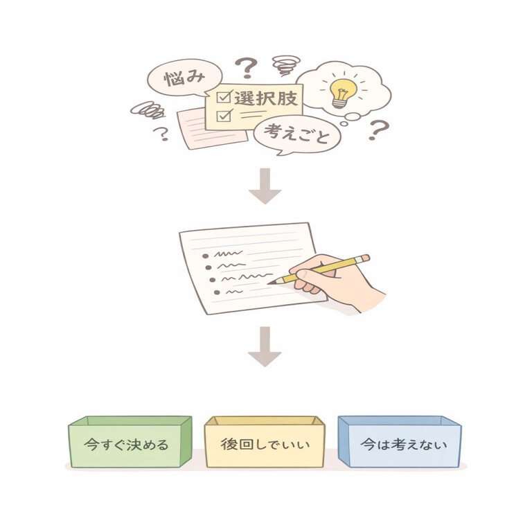 選択に悩みすぎて頭が重くなる原因は、考え不足ではなく思考が混ざっているから。判断を3つに仕分け、30分で整理するシンプルな方法を解説。誰でも実践でき、決断の負担が軽くなる。
