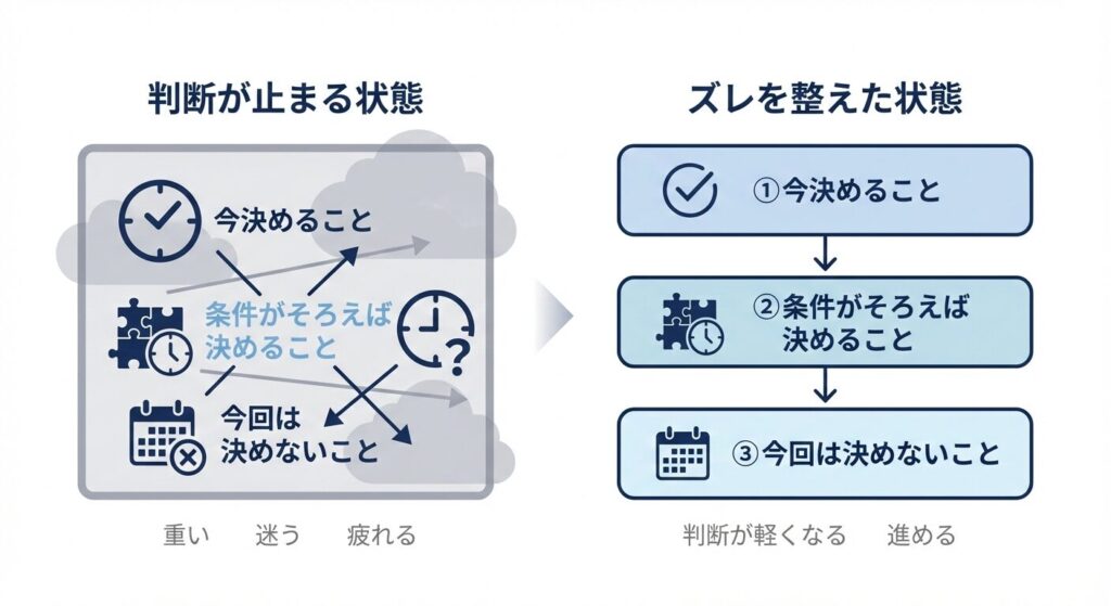 私の視点では、決断できない状態には共通する構造があります。それは、「今決めること」「条件がそろえば決めること」「今回は決めなくていいこと」が混在している状態です。